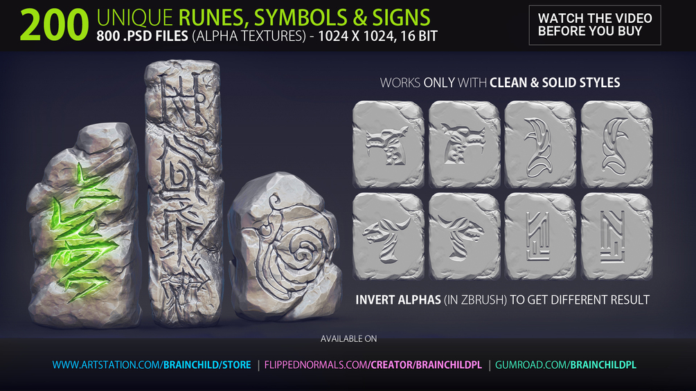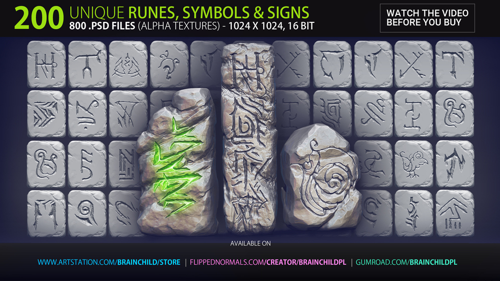 VOL. 3 - 200 Runes, Signs & Symbols (800 Alpha Textures) Zbrush, Blender, Substance..
